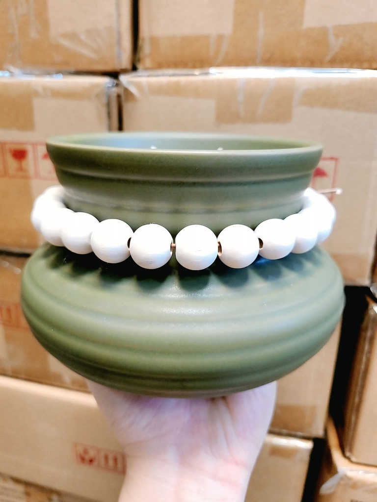 nến thơm CW Studio Magnolia Juniper. Nến được đựng trong cốc gốm màu xanh lá và trang trí bằng chuỗi hạt gỗ dọc theo vành cốc.