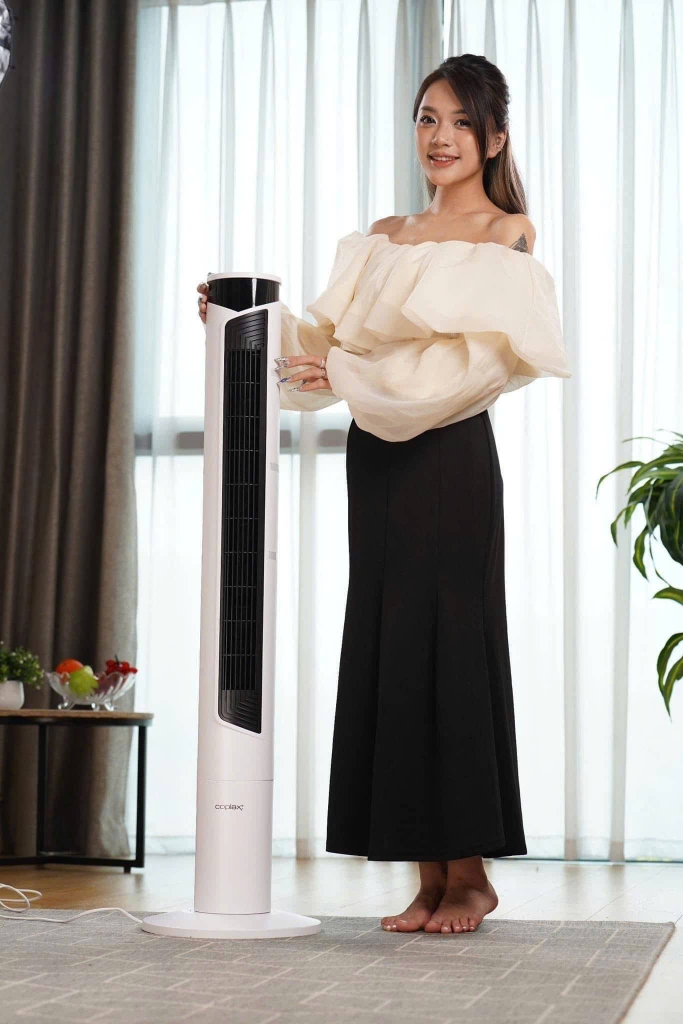 Cao 1,1m, thân quạt mảnh chỉ 12cm, tiết kiệm không gian – lý tưởng cho phòng khách, phòng ngủ hoặc văn phòng.